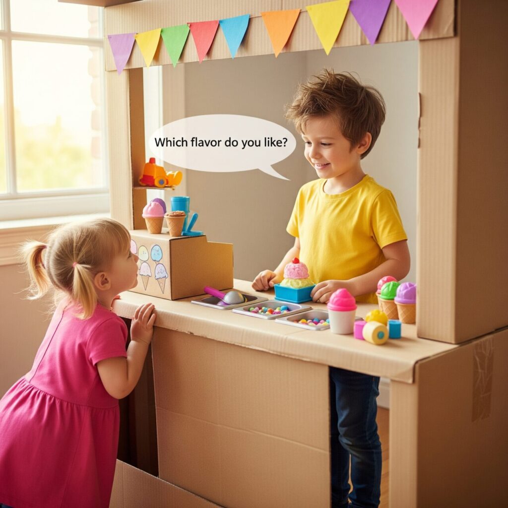 お店屋さんごっこは、子どもの社会性や想像力を育む素晴らしい遊びです。ここに英語を取り入れることで、お子様は遊びながら自然に生きた英語に触れることができます。