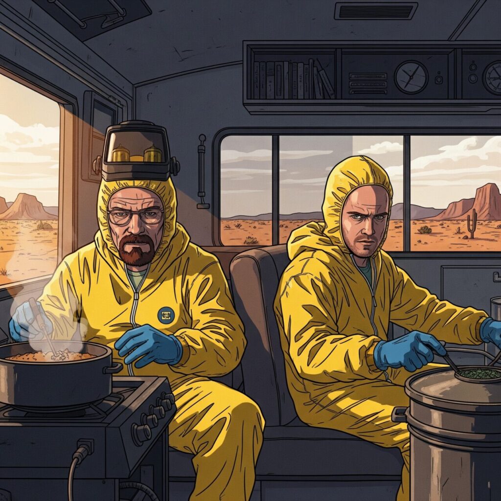 English: Walter White is a brilliant but underachieving high school chemistry teacher in Albuquerque, New Mexico. After being diagnosed with terminal lung cancer, he decides to use his chemistry skills to produce and sell high-quality methamphetamine. His motivation starts as a desperate attempt to secure his family’s financial future, but it slowly evolves into a quest for power and respect, transforming him into the ruthless drug kingpin known as “Heisenberg.”