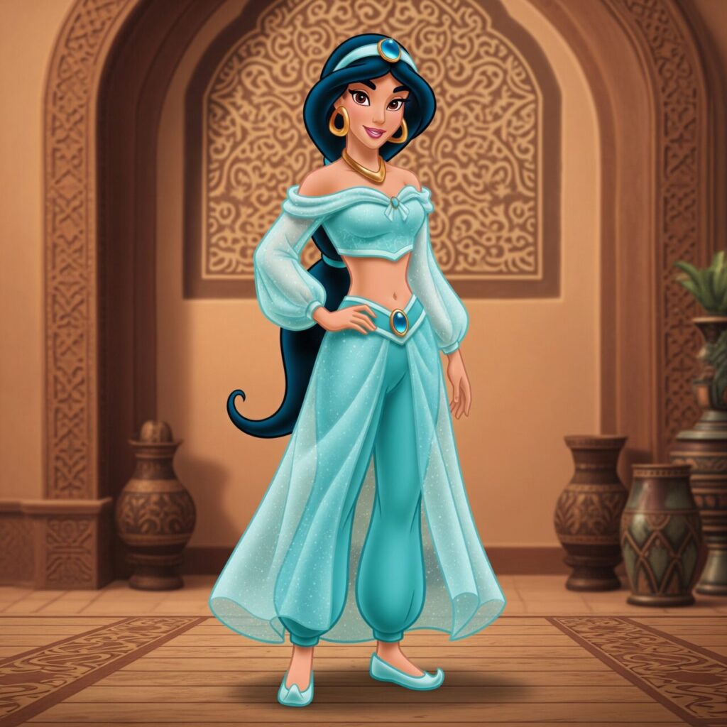 Jasmine breaks the mold of traditional princess gowns with her iconic two-piece outfit, reflecting her independent and free-spirited nature.