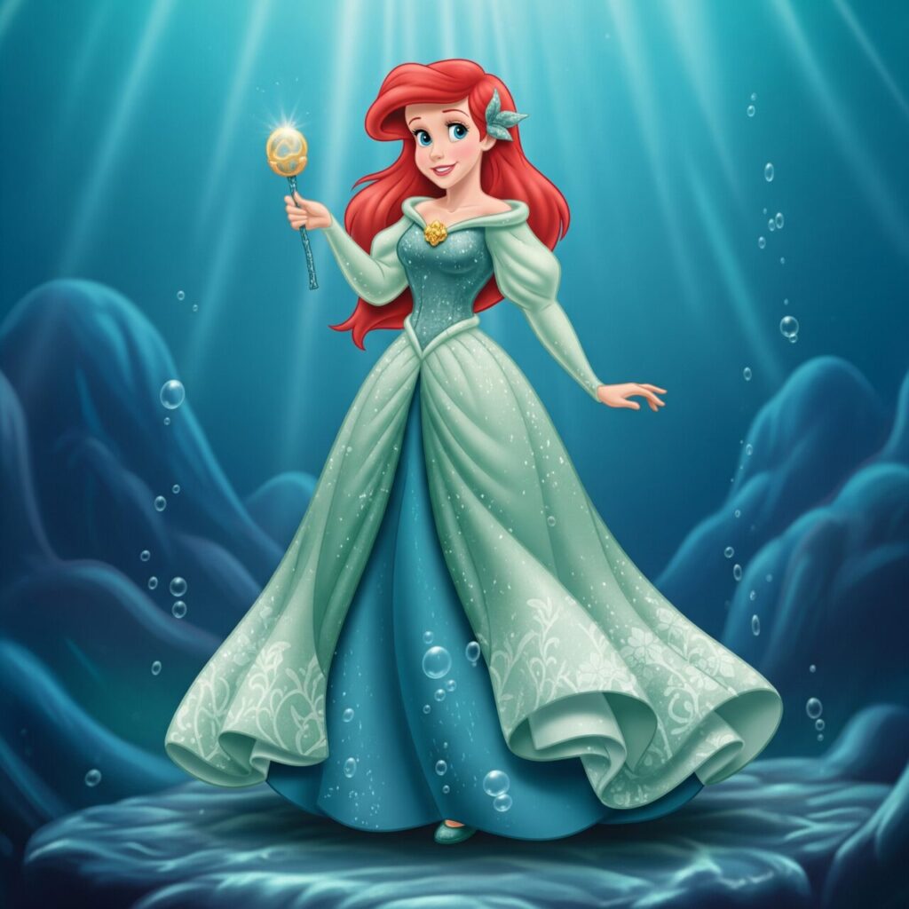 アリエルには記憶に残る衣装がいくつかありますが、エリック王子とのデートで着る、海の泡のような緑色のドレスは特に素敵です。