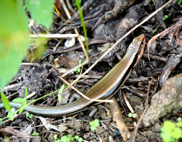 Native to Japan, juveniles have five distinct light stripes and a blue tail. Adults become more uniformly brown.(日本固有種で、幼体には5本の明るい縞模様と青い尾があります。成体はより均一な茶色になります。)