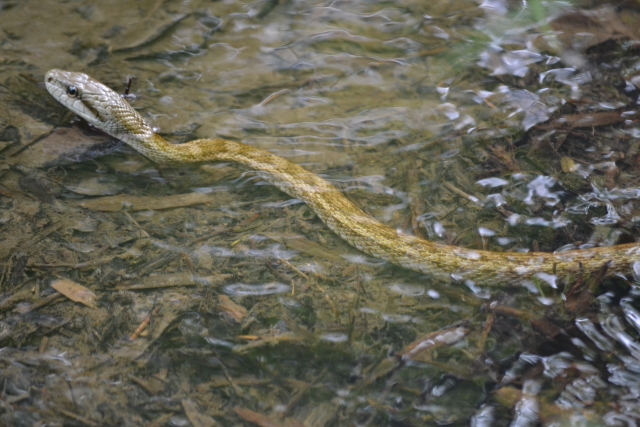 One of the largest snakes in Japan, non-venomous and often found in various habitats. Can be gray, green, or black.(日本で最大級のヘビの1つで、無毒で、様々な生息地で見られます。灰色、緑色、または黒色をしています。)