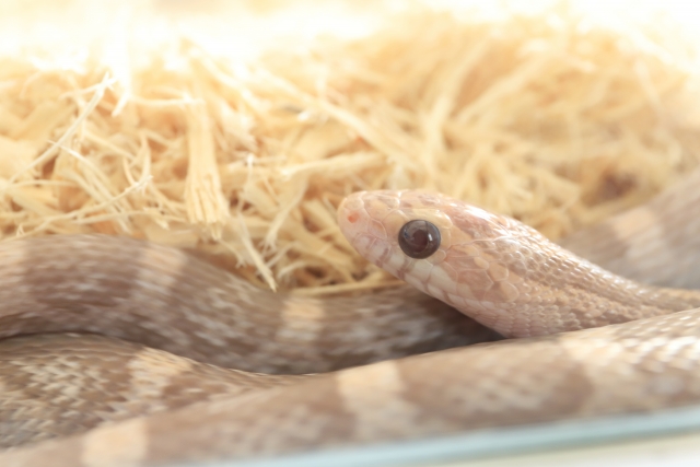 A popular pet snake due to its manageable size, docile nature, and attractive patterns.(扱いやすい大きさ、おとなしい性格、魅力的な模様から、人気のペットスネークです。)